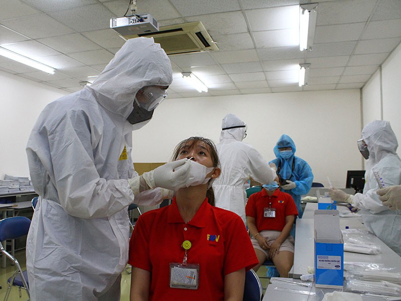 Lực lượng y tế đang lấy mẫu xét nghiệm tại một công ty ở khu chế xuất Tân Thuận. Ảnh: MINH TÂM